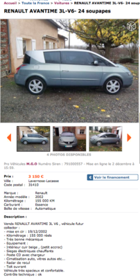 Voici la réponse du pseudo vendeur : Bonsoir je vous faire parvenir ce mail suite a votre intérêt pour Renault Avantime a vendre a 3500 euro Première main jamais accidentée pneu neuf révision générale faite sans aucun défaut aucune réparation n'est à prévoir voiture très économique et résistante si ...