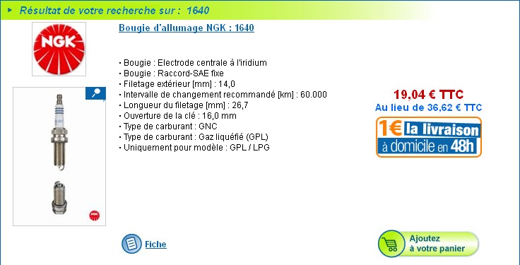 6 NGK/Bougie d'allumage - 1640 : 18,22 € l'unité => 109,29 €. Elles sont parfaites pour mon moteur, sachant que j'ai du GPL. Chères, mais 100% compatibles.