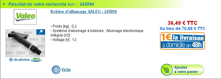 6 VALEO/Bobine d'allumage - 245094 : 36,79 € l'unité => 220,73 €. Pas content, c'est du SAGEM. A fuir