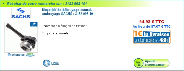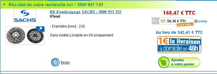 1 SACHS/Kit d'embrayage - 3000 951 155 : 197,73 € l'unité. C'est du Valeo si je me rappelle bien. Content en tout cas.