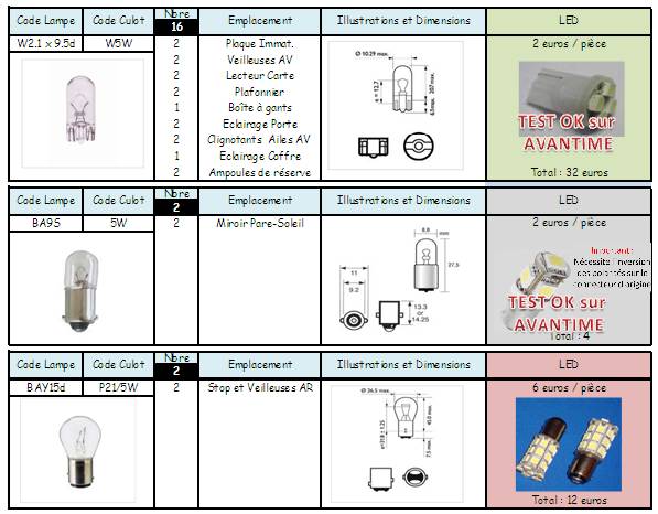 de mémoire sur le vaisseau j'avais les ampoules "plafonnier","coffre"et "portes" légèrement différente (plus courte d'un choullia) que les ampoules "lecture de carte", "plaque" et "veilleuses avant"...