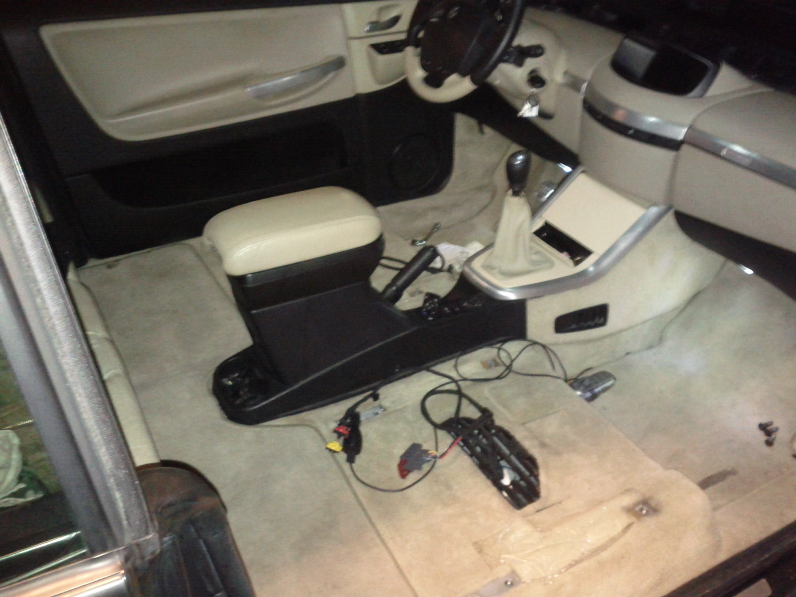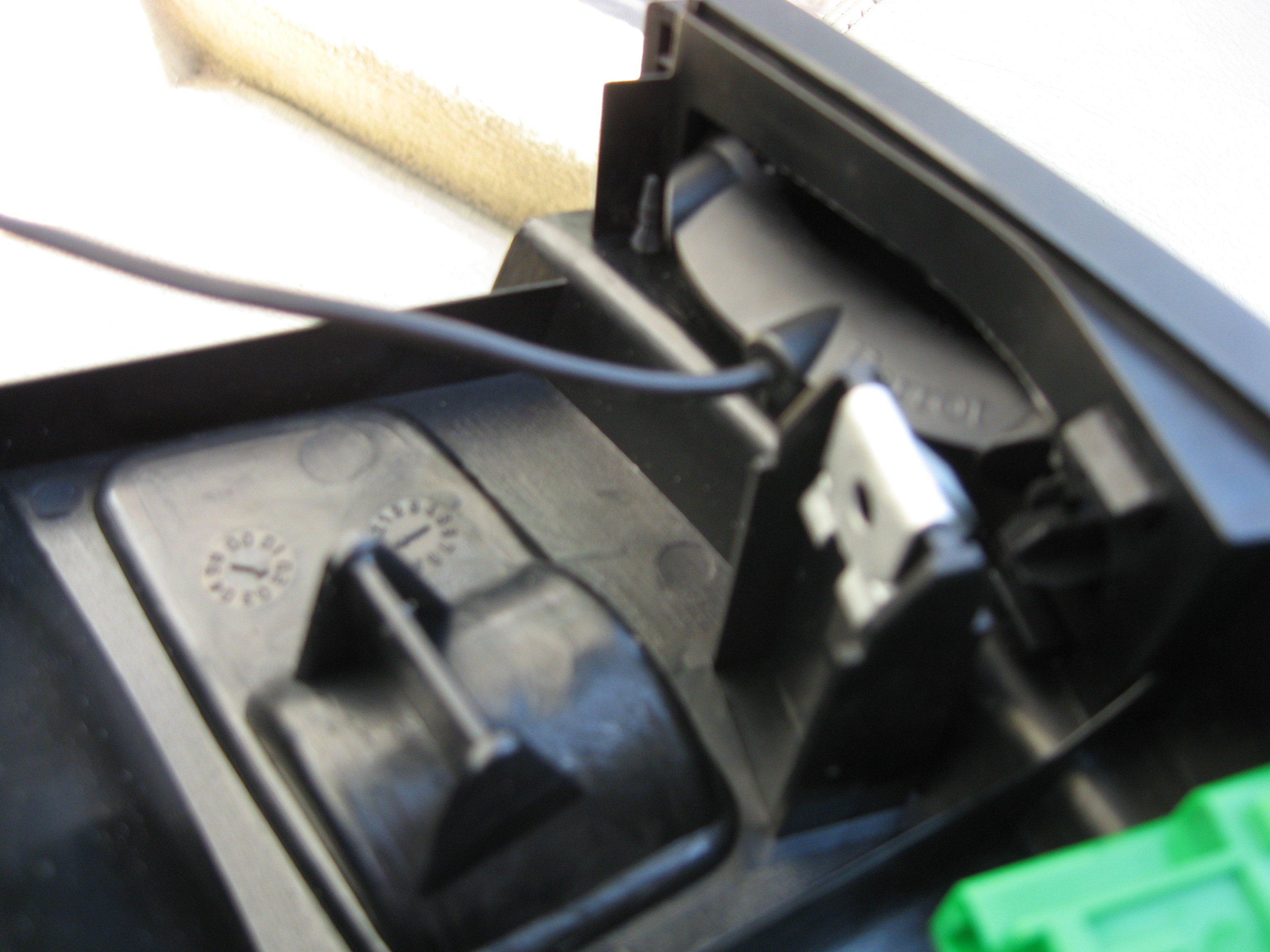 - La partie noir arrière de l'accoudoir, celle ou on a la prise allume cigare doit être démontée pour passer le câble.