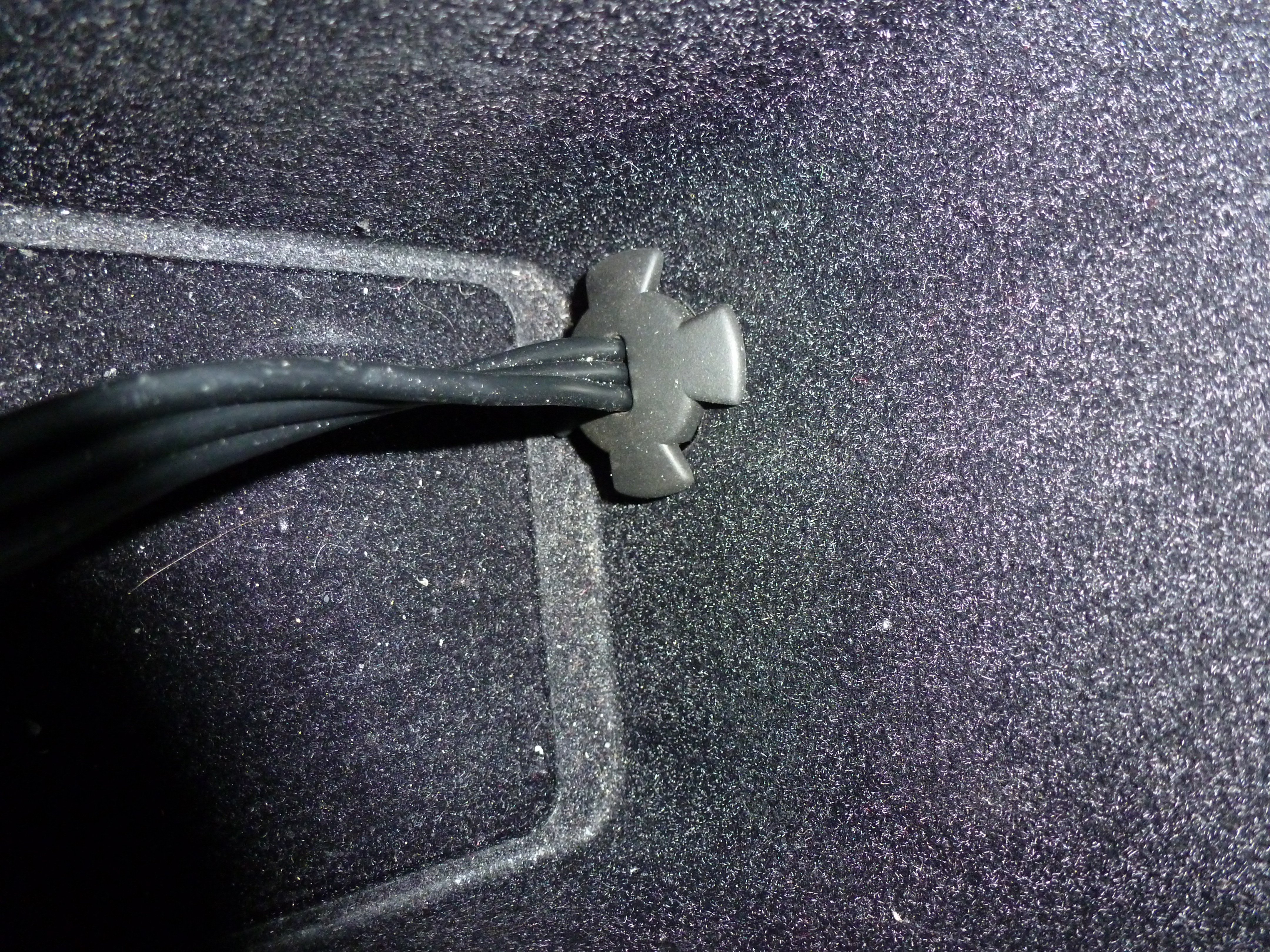 - le trou pour le câble auxiliaire doit se faire en partie arrière de la boite accoudoir, partie noir lisse intérieur, et cela après démontage mais attention de ne pas faire le trou trop bas pour pouvoir mettre la pièce " passage de fils " fournie .
