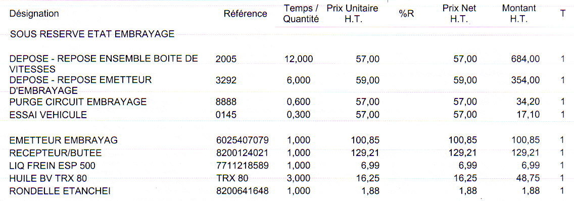 Par contre, ce qui m'étonne, c'est que les références des pièces ne sont pas toutes les mêmes : identiques pour l'émetteur, elles diffèrent pour le récepteur : la garantie a payé le récepteur 69,19€HT sous réf. 8200846748 (contre 129,21€HT sous réf. 8200124021 du garage de M-L) ; et 214,80€HT l'embrayage sous réf. 7711135978 (contre 306,26€HT sous réf. 7701475950 du garage de M-L). Et cerise sur le gâteau, je n'ai payé que 1,5h de MO pour le remplacement de l'émetteur-récepteur (en plus des 12h de dépose-repose de la BV) contre 6h prévues au devis de M-L... Au total, l'écart de prix est tout de même de l'ordre de 800€ sur une facture qui aurait pu s'élever à 2000€ !