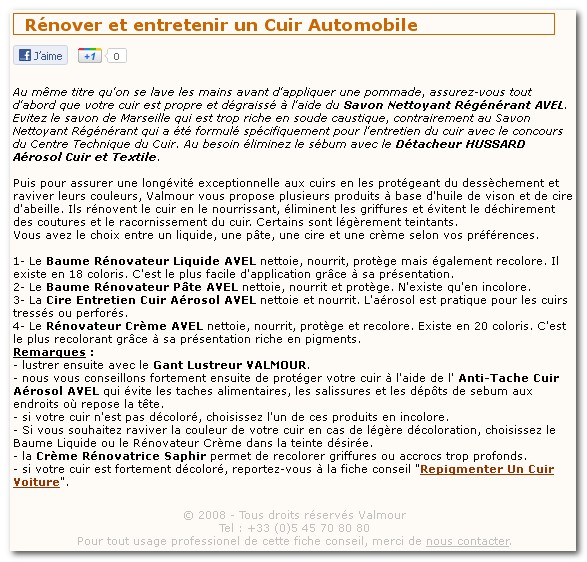 Produits utilisés : Baume Rénovateur Crème AVEL (12,50€ / 250ml : suffit à plusieurs applications ; à prendre en incolore si pas de problème de décoloration) ou plus pratique en aérosol : Cire Entretien Cuir Aérosol AVEL (14,27€ / 400ml), ou pour ceux qui préfère les produits liquides : Baume Rénovateur Liquide AVEL (17,15€ / 500ml)