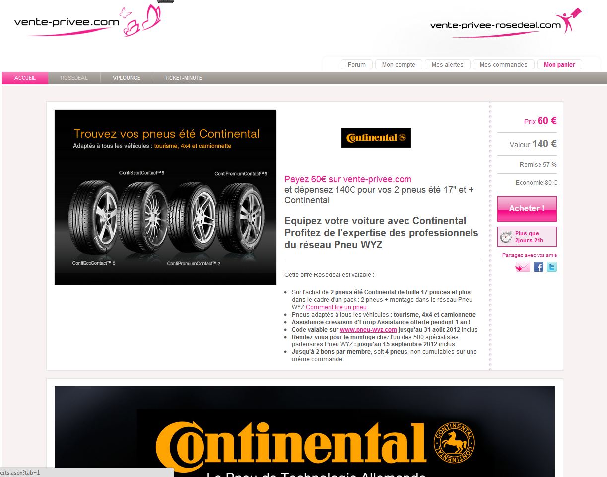 Continental vous propose en partenariat avec vente-privee.com un bon Rosedeal d’une valeur de 140€ au prix de 60€ valable sur l’achat de 2 pneus Eté Continental de 17 pouces et plus (diamètre) sur le site http://www.pneu-wyz.com.