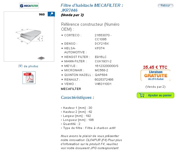 Kit 2 Filtres à Charbon actif - Réf. 60 25 372 486 (75,58€TTC chez Renault en avril dernier)