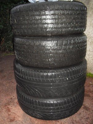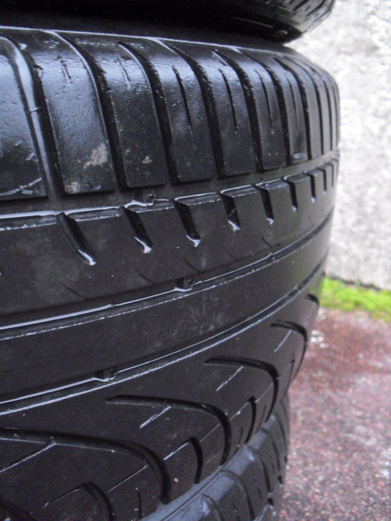 2 d'entre elles sont montées en pneus Michelin Alpin 225/45R17 91H (DOT 3002), mais un des deux pneus bien qu'avec une bande de roulement encore bonne est HS (hernie sur l'intérieur).
