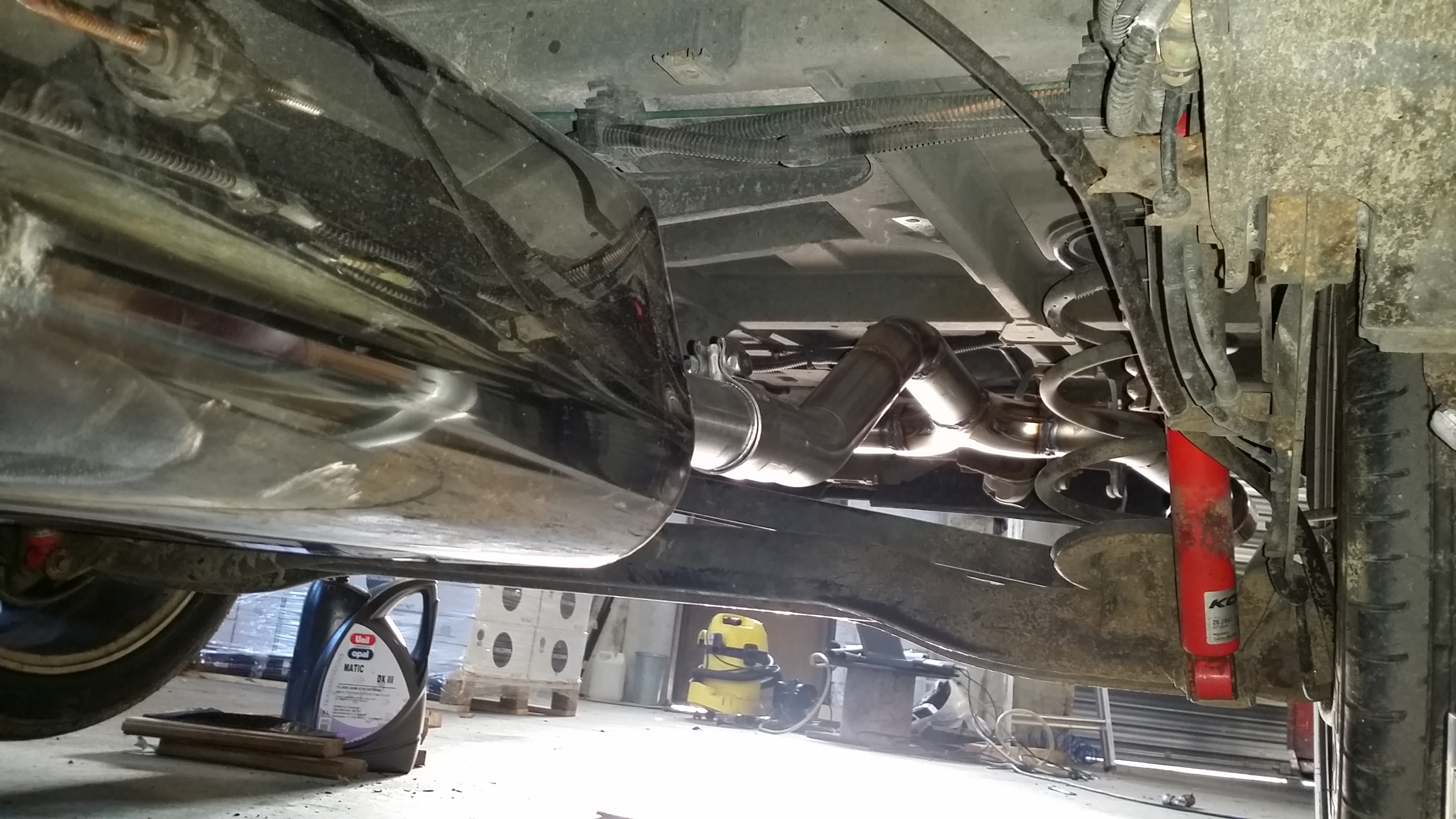 Quatrième photo, découpe pour faire passer la sortie droite tout près du ressort de suspension droit; il faudrait refermer cette partie avec une pièce vissée qui passerait en dessous du tube. Et attention à la rouille et au CT s'il voit cette découpe?VLNC1962 a écrit :Jolie boulot et intéressante solution.....je vois pas trop ou le châssis a été découpé exactement.