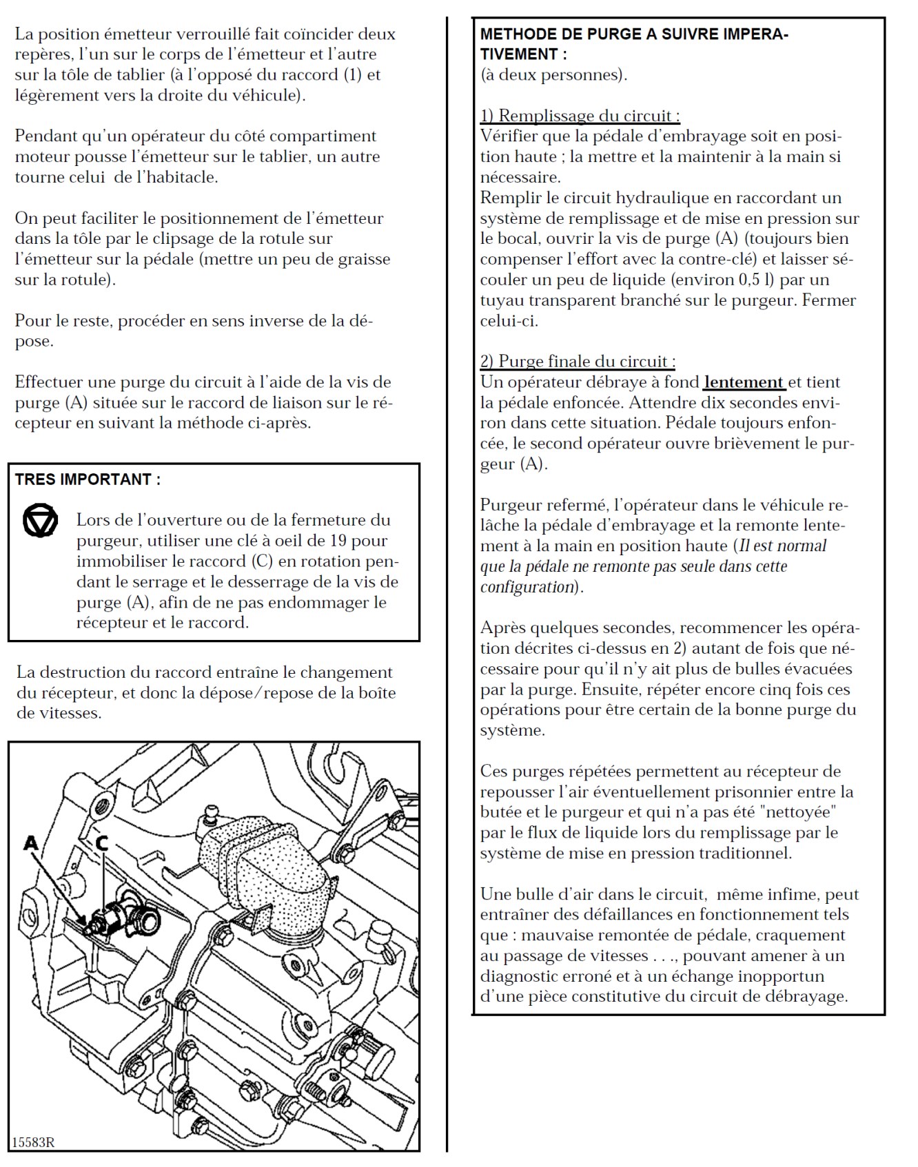 Tu démontes la boite à air pour avoir accès au cul du récepteur qui sort de la cloche d'embrayage. Il y a une petite vis de purge, logiquement recouverte d'un petit capuchon en caoutchouc que tu retires. Ensuite, tu demandes au gars à la pédale de descendre doucement et toi, tu dévisses la vis de purge !, quand la pédale est en bas, tu fermes la vis de purge et le gars remonte la pédale si elle ne remonte pas toute seule. Tu renouvelles l'opération plusieurs fois, tant qu'il y a de l'air qui sort, mais des fois, tu ne t'en aperçoit pas. N'oublie pas de compléter le liquide de frein dans le bocal (car ça prend le même que pour les freins). Ensuite, tu peux essayer de débrayer sans desserrer la vis de purge pour voir si la pédale débraye plus tôt. Mais seule l'utilisation te dira si ça a vraiment marché.