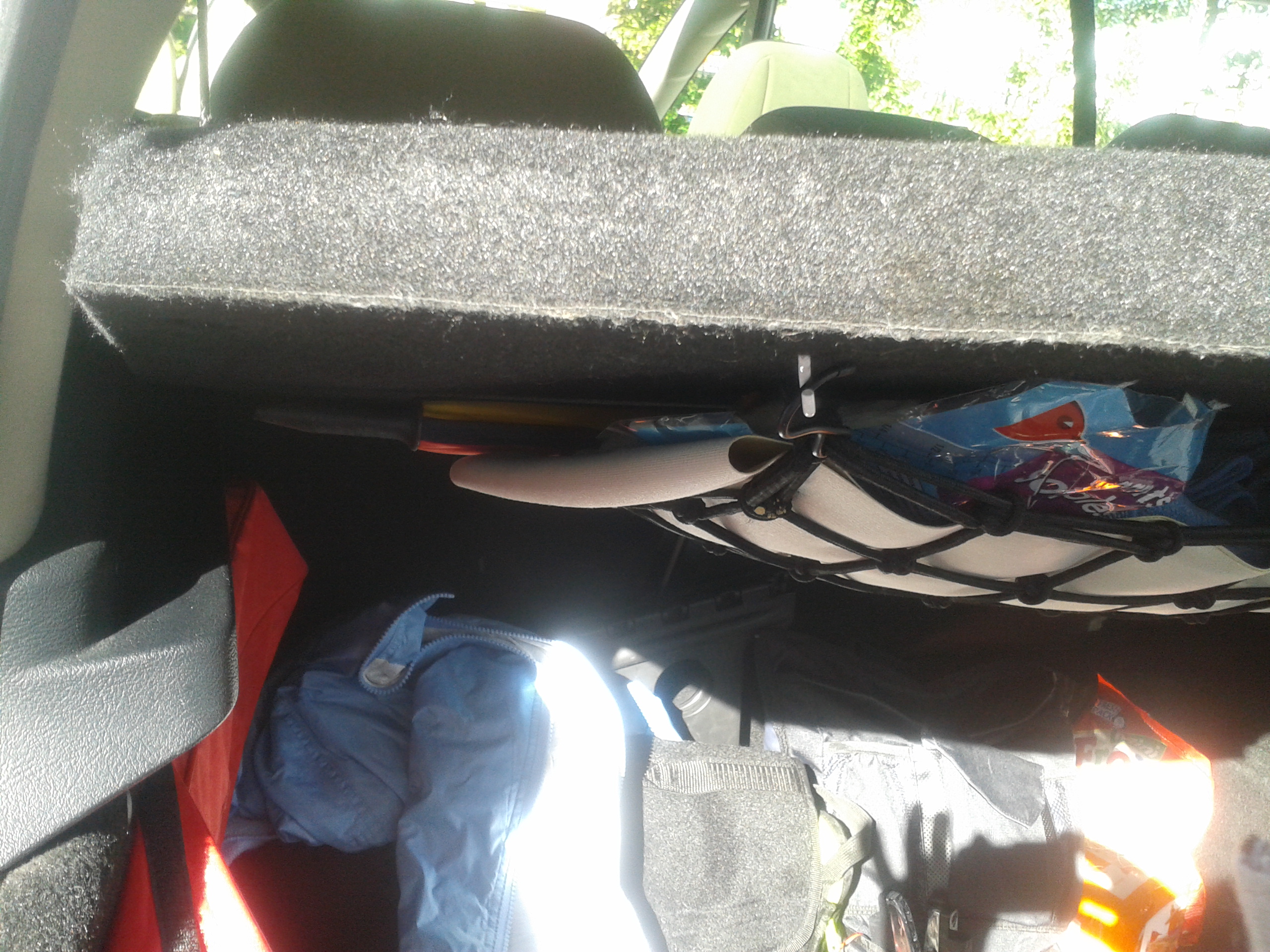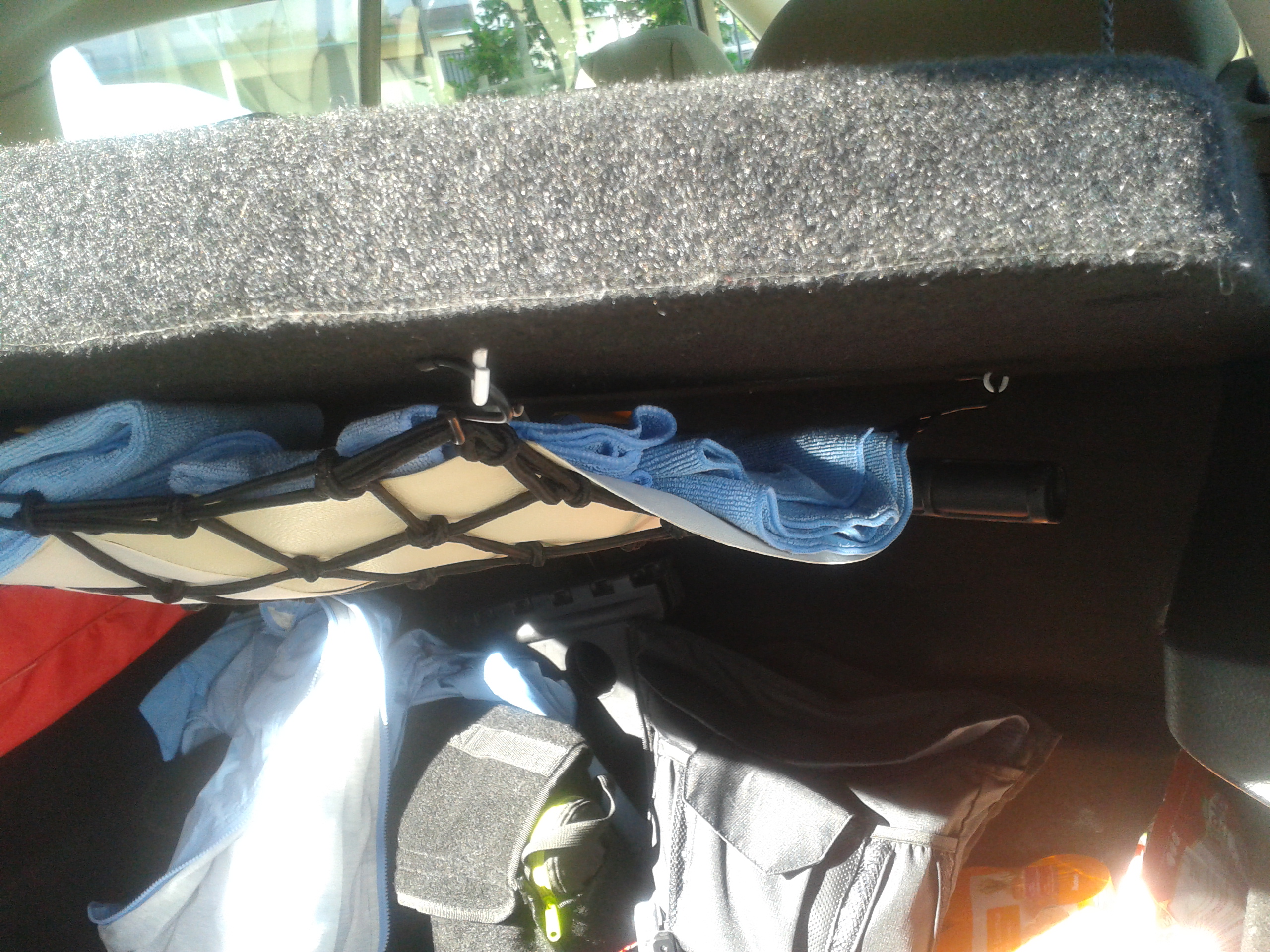 moi ce que j ai fait j ai acheté un filet de coffre chez norauto 5 euros et je l ai fixe avec des crochets a rideaux sur l envers de la plage et je peut y mettre mes lingettes, gangs, parapluie