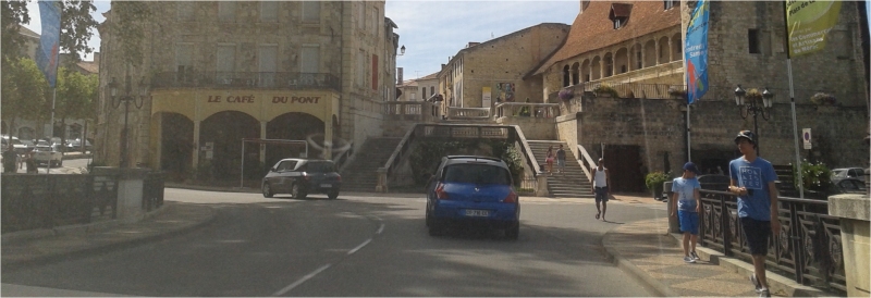 Holà manant, mais qui sont donc ces carrosses qui osent franchir ce pont réservé aux seigneurs d'Albret : Drôles d'engins certainement venus du futur, remarquez le premier qui tel un véhicule de Bond, non pas toi François... James, James Bond, posséde un passage pour le lance-roquette miniaturisé dans le pare-choc avant...c’est pour ça que nous l'avons laissé devant au cas où il ferait une fausse manip