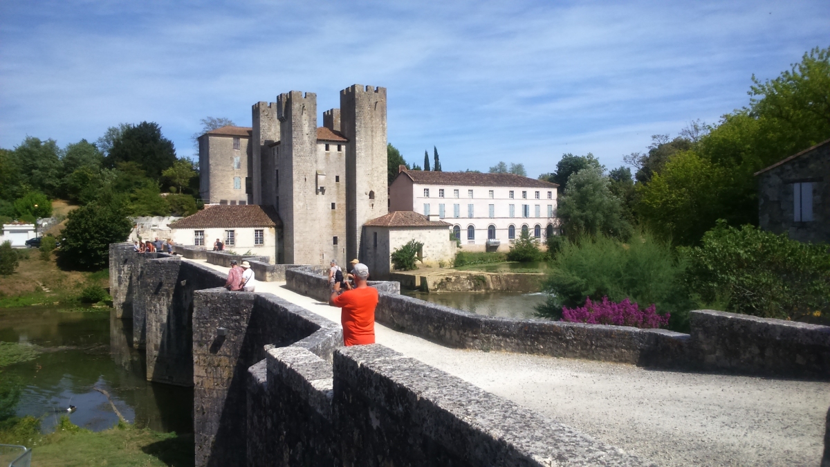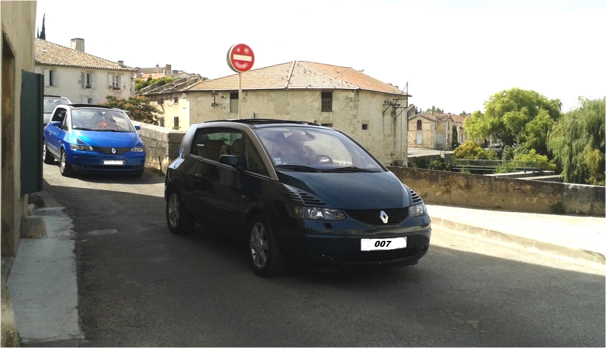 Holà manant, mais qui sont donc ces carrosses qui osent franchir ce pont réservé aux seigneurs d'Albret : Drôles d'engins certainement venus du futur, remarquez le premier qui tel un véhicule de Bond, non pas toi François... James, James Bond, posséde un passage pour le lance-roquette miniaturisé dans le pare-choc avant...c’est pour ça que nous l'avons laissé devant au cas où il ferait une fausse manip