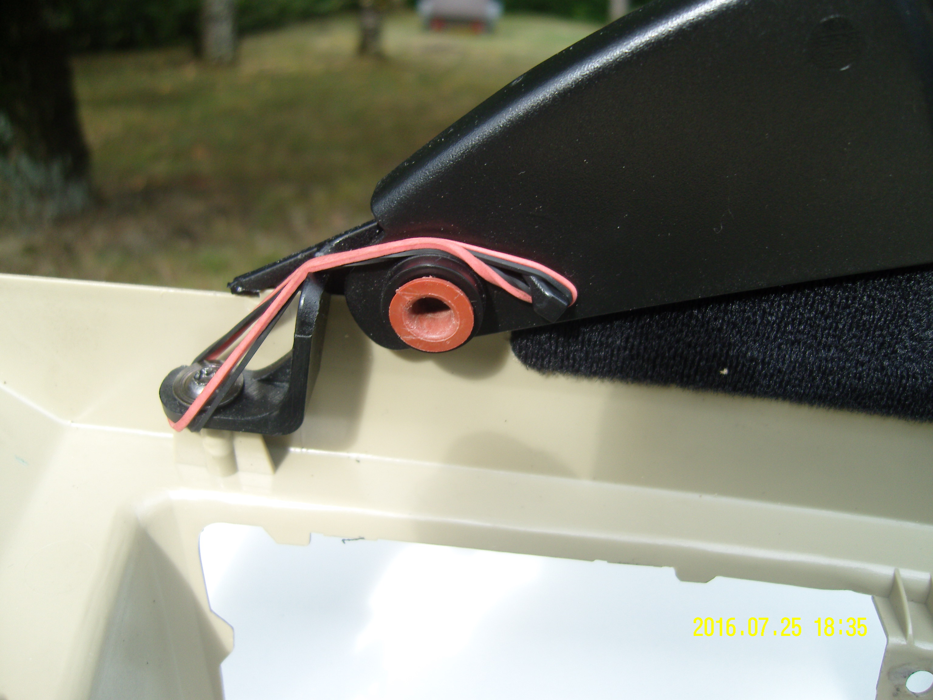 Ayant un peu de temps "libre" je m'attaque à ce foutu volet qui ne bouge que quand je tire dessus. Grâce au tuto l'ouverture est facile et...j'ai beau chercher... plus de ressort et comme sur la photo il ne reste qu'un petit bout du U. Un peu fainéant je modifie le système à ressort par un modèle à élastique installé en 5 minutes avec juste la suppression du morceau de U restant et par l'accrochage de l'élastique (j'ai rajouté un rouge sur le noir pour mieux voir sur la photo) puis poussé un obturateur dans l'orifice du pivot et... cela va bien :roll: :mrgreen: