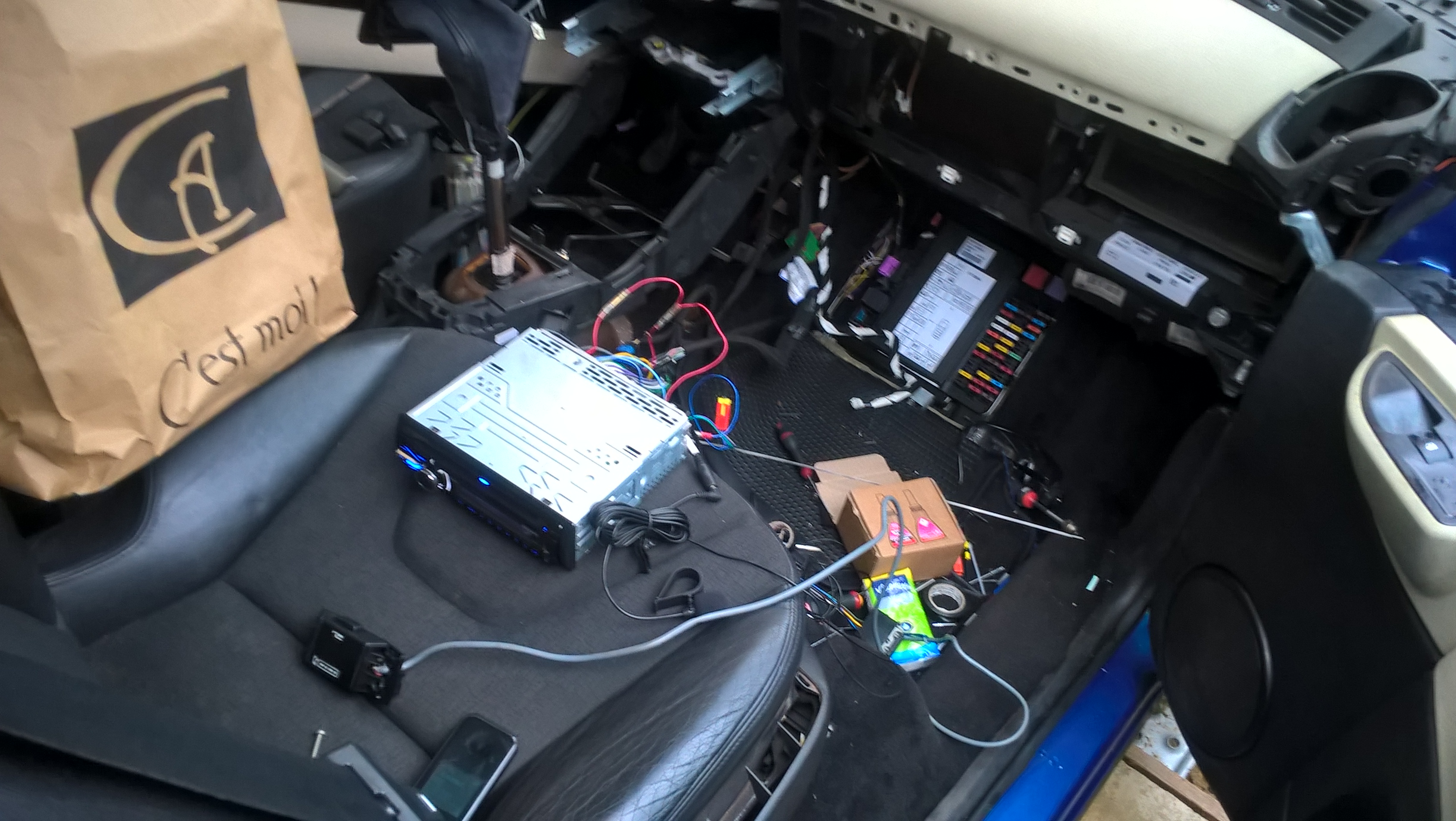 Il n'y a rien de compliqué : il suffit de prendre les fiches qui arrivent à l'ampli et de les connecter à ton autoradio. Le plus compliqué c'est de demonter le siege passager pour y accéder.