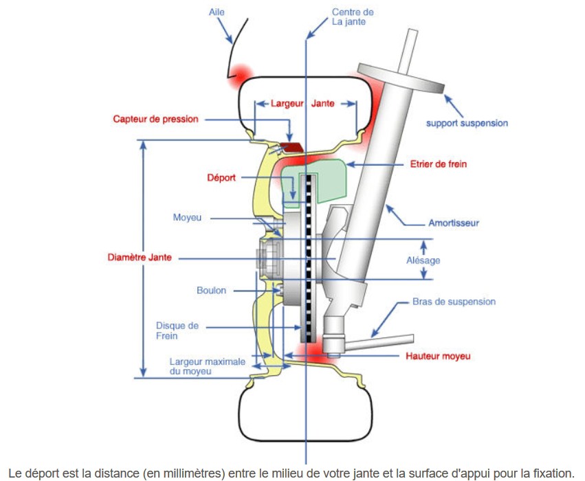 En résumé du dessin: plus l'ET augmente, plus la roue et son pneu "rentre" sous la voiture, avec le risque de toucher un des éléments environnants: disque, rotule, amortisseur ...