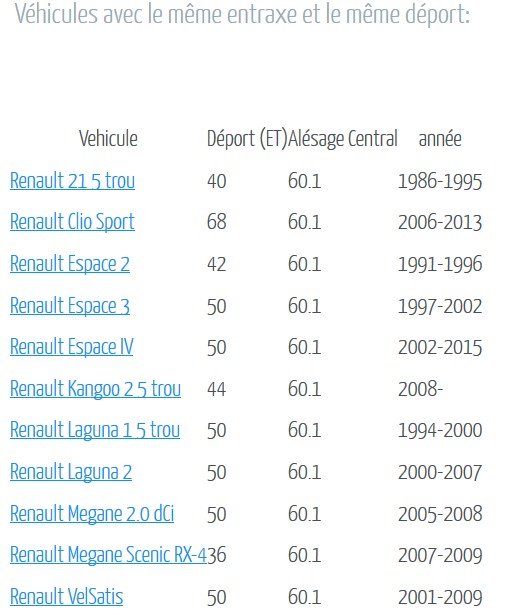 Ci-joint un tableau des "ET" souvent non indiqués, pour des ventes de jantes de provenance du Losange avec le centrage de 60,1 mm, c'est le minimum, mais pas suffisant pour éviter , par exemple, de coincer ses disques de freins et autres du même tonneau :roll: