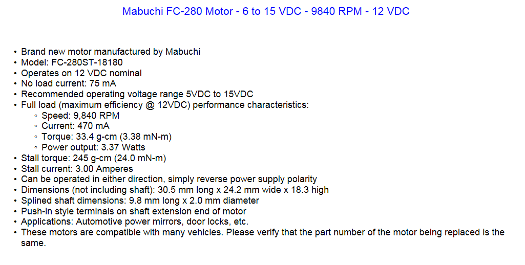 Dans mes notes j'ai bien: Mabuchi FC-280-ST 18180 (environ 8€), et voir Motrax(x)(environ 6€), puis Modial (moins de 2€ ce dernier), mais la panne étant supprimée, je n'ai pas donné suite :wink: