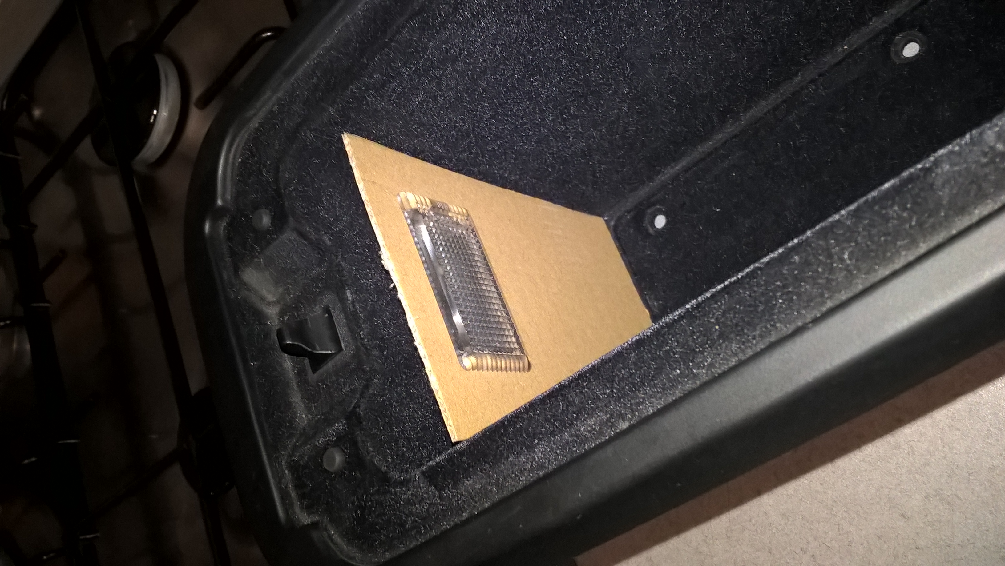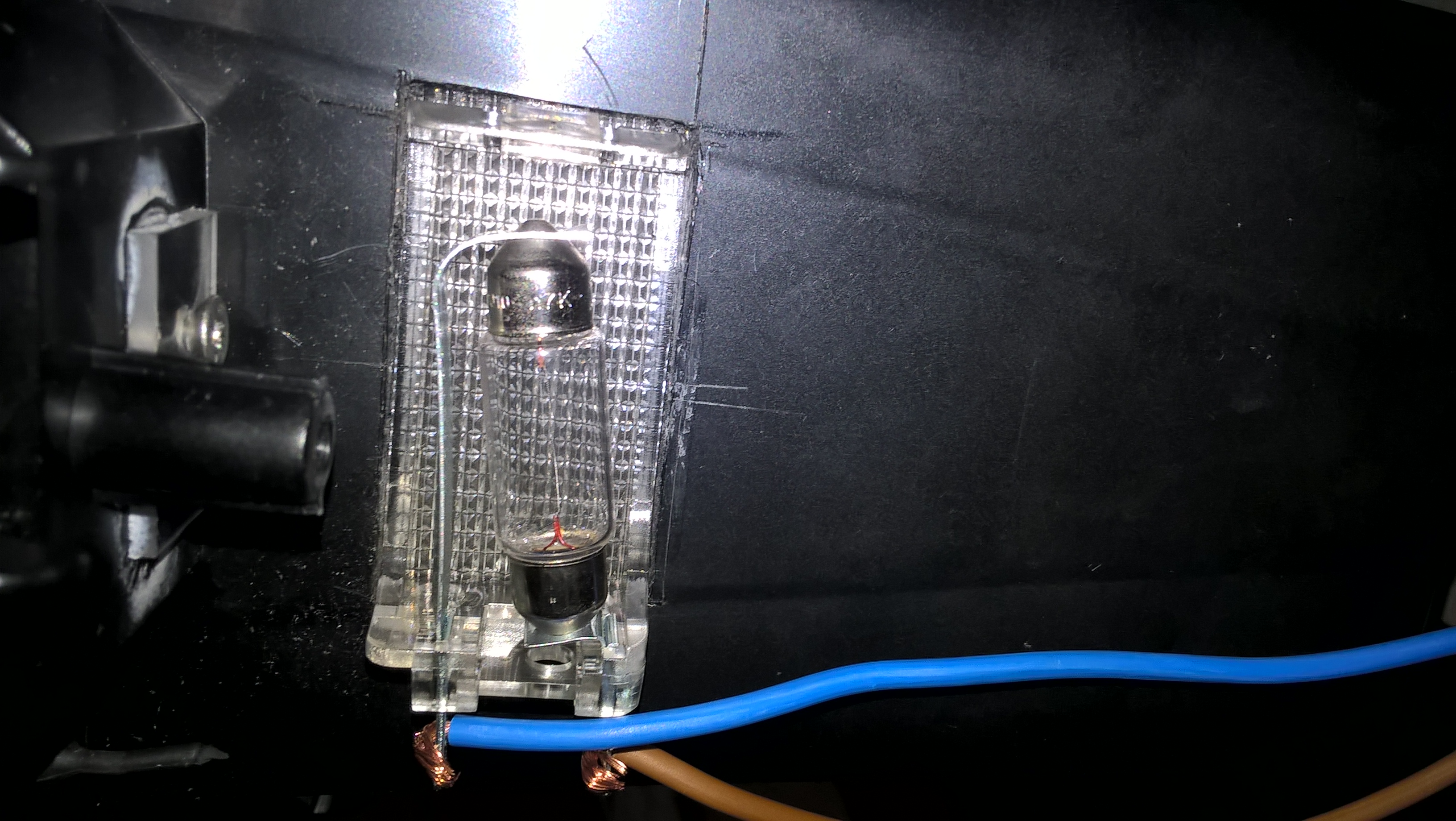 La led utilisée est une blanche type compteur, j'ai soudé les fils à la base avant de coller la lampe derrière. Pour moi c'est assez lumineux la nuit, sans m'éblouir la nuit quand j'ouvre l'accoudoir.