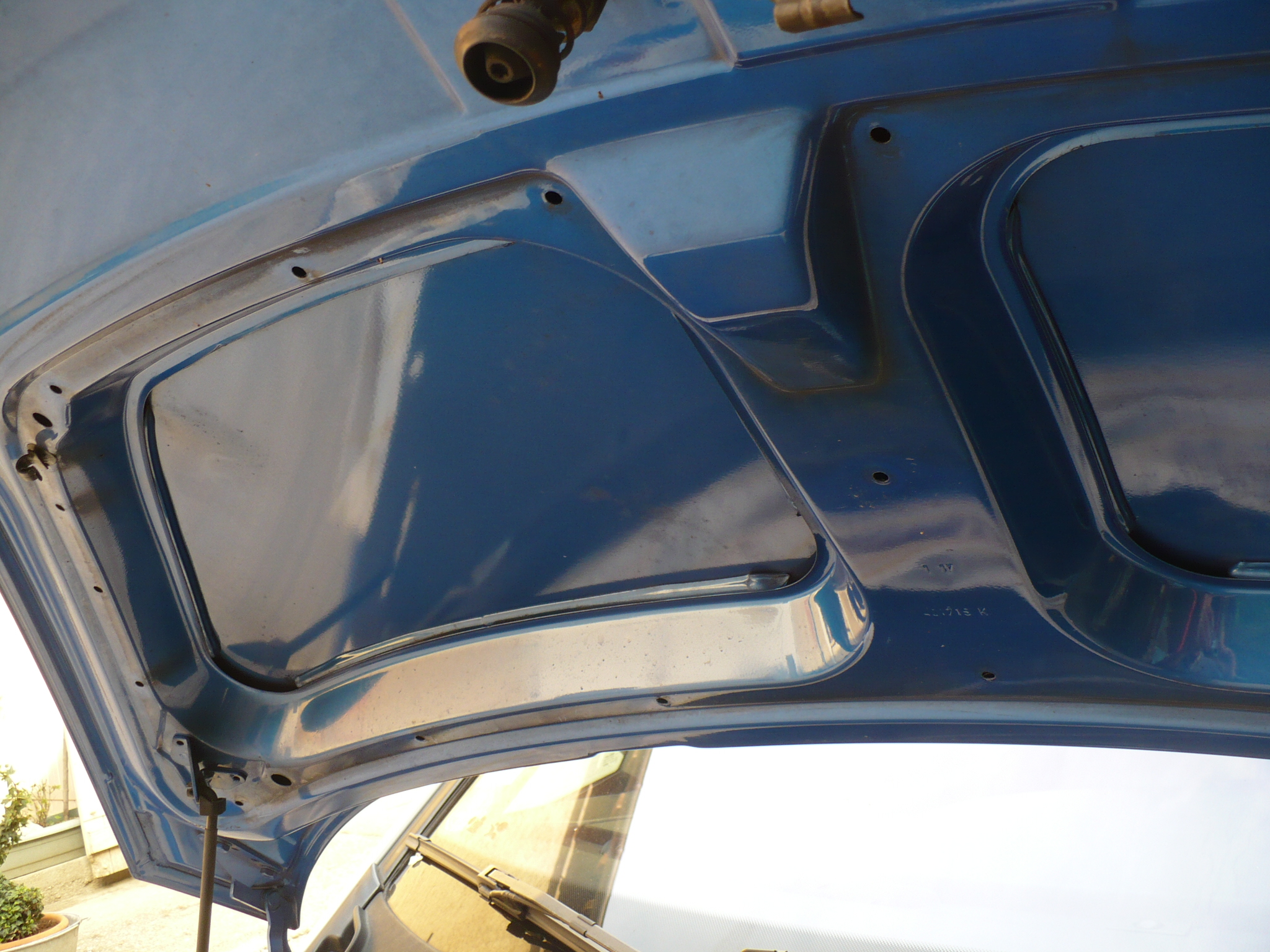Avant de remonter la garniture, j'ai donc collé deux plaques d'insonorisant de 30mm piquées, à la casse, sur une Mercedes dans le vaste logement laissé libre par l'épaisseur des renforts de capot.