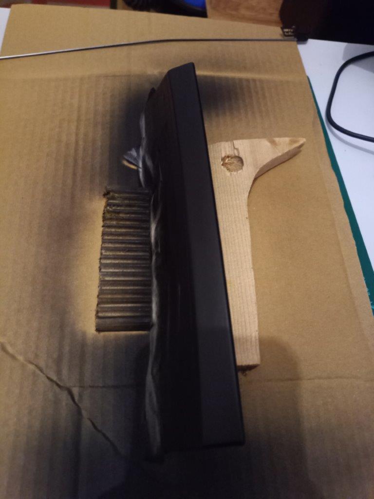 donc à ce point, ponçage grain 500+eau puis 2 couches légère de julien noir mat plastique a 10min d'écart