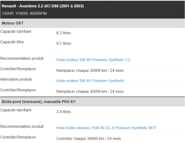 Mais l'essentiel, c'est que ton carrosse soit en parfait état avec la bonne quantité de lubrifiant, avec sans doute un affichage au tableau de bord, correspondant au niveau indiqué par la jauge "mécanique" manuelle.Il me semble que les deux autres motorisations, sont autour des 5 litres d'huile pour le L7x et 4,9 litres pour le F4Rt...
