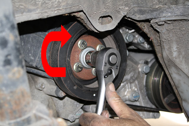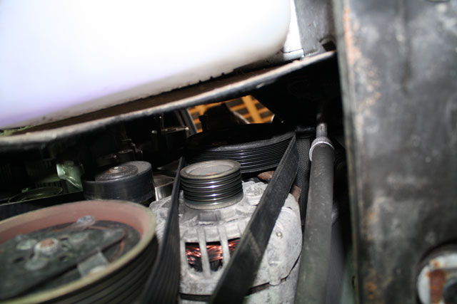 Nous reprenons par démonter la poulie de direction assistée en utilisant la vieille courroie d'accessoires afin de bloquer la rotation pendant le dévissage :