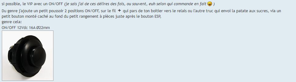 Du genre j'ajoute un petit poussoir 2 positions ON/OFF, sur le fil + qui pars de ton boitier vers le relais ou l'autre truc qui envoi la patate aux sucres, via un petit bouton monté caché au fond du petit rangement à pièces juste après le bouton ESP,