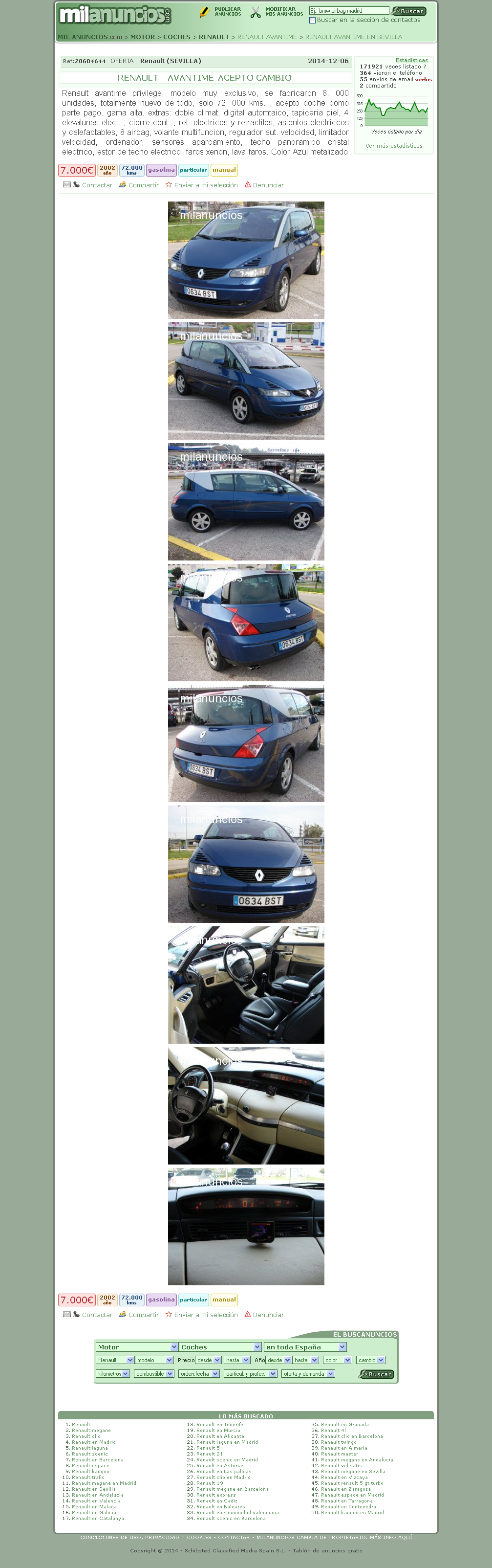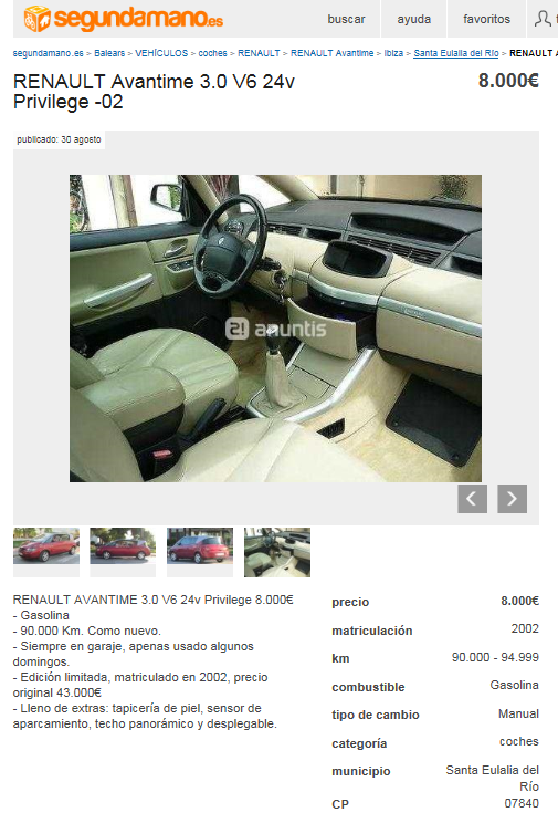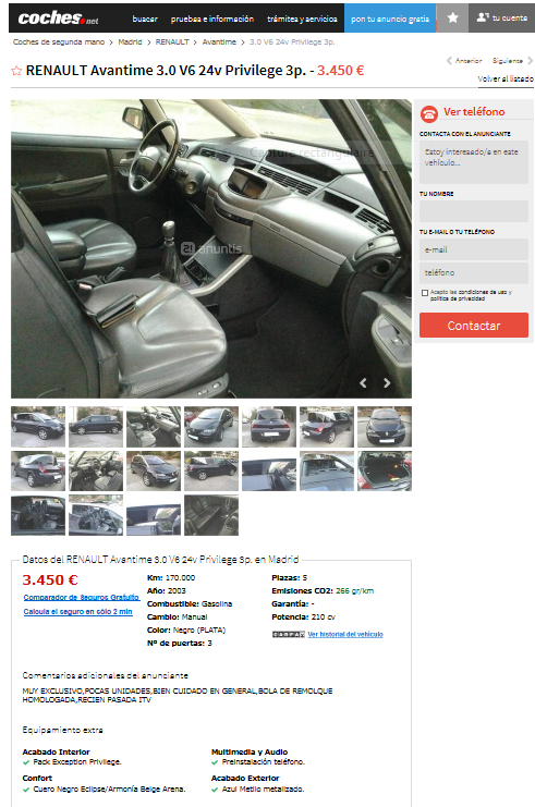 je vous faire parvenir ce mail suite a votre intérêt pour Renault Avantime a vendre a 3500 euro Première main jamais accidentée pneu neuf révision générale faite sans aucun défaut aucune réparation n'est à prévoir voiture très économique et résistante si je la vend c'est suite à ma famille qui s'agrandit puisque ma femme vient d'accoucher et il nous faut une voiture plus espacée si non le contrôle technique est fait pour la vente avec car pass et demande d'immatriculation la peinture et très propre et d'origine vraiment c'est une très bonne voiture je vous propose un rendez-vous chez vous plus simple pour vous de voir ma voiture et l'essayez si cela est comme décrit dans mon mail vous passez au payement sans aucun problème si non vous désistez sans problème la voiture se trouve à cette adresse...40390 Biarrotte | Landes...mais vue que je travaille jusqu'à 20h du soir je serai dans l'obligation d'organiser le rendez-vous chez vous alors merci de bien vouloir me laisser le lieu de rencontre et aussi vos noms; prénoms ;numero téléphonic y compris l adresse.