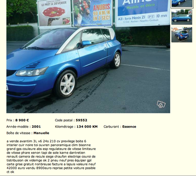 Concernant la vente de ma voiture Renault Avantime Privilège , je vous rassure qu'elle est dans un état irréprochable et proche du neuve au prix de 2200 € TTC.