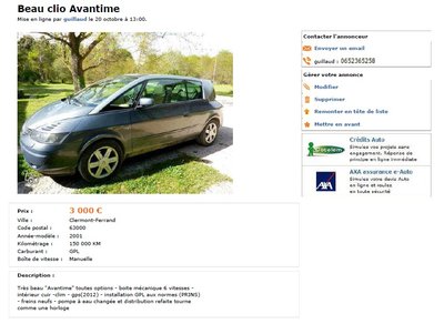 Contre tenu de mes dette j'ai décidé de la cédé à un prix ferme de 2200€ c'est ce qui explique la vente de ma Renault Avantime Privilège...