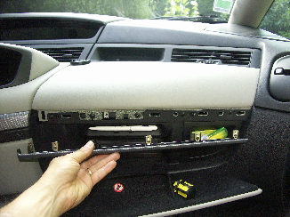 => sur le côté passager de la console centrale, au niveau des pieds, de mémoire il y a un câche plastique à demonter et qui permet d'acceder à l'arriere de la console; je n'ai pas mon avantime sous la main et cela fait bien 5 ans que j'ai fait cette manip. .