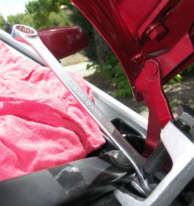 Après avoir retiré les deux boulons des bras d'essuie-glaces, je me sers d'un arrache-rotule pour ne pas forcer.