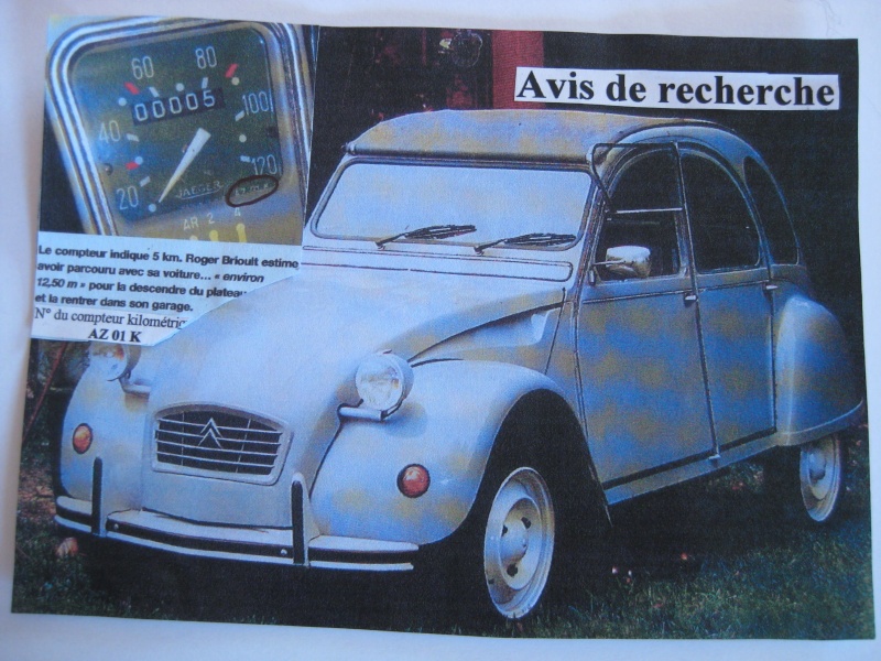 Oui je sais vous devez trouver le titre peut commun sur notre forum ! mais je pense pouvoir attirer votre attention sur cette alerte vol de la 2 CV de Roger Brioult qui a été volée dans l’Orne où elle se trouvait. C'était la dernière 2 CV produite en France à l'usine de Levallois et commercialisée en France. Cette 2 CV conservée strictement neuve depuis sa livraison sur remorque-porte voiture n'a jamais été immatriculée. De couleur Gris Cormoran, elle a été produite le 18 mars 1988 et porte le numéro de châssis 86 977 116. Si vous avez des informations à son propos, merci de prendre contact avec : - la Gendarmerie : 02 33 12 47 95 - Roger Brioult : 02 33 35 62 75 - Michel Feret : 06 86 77 37 67 Merci d'avance .