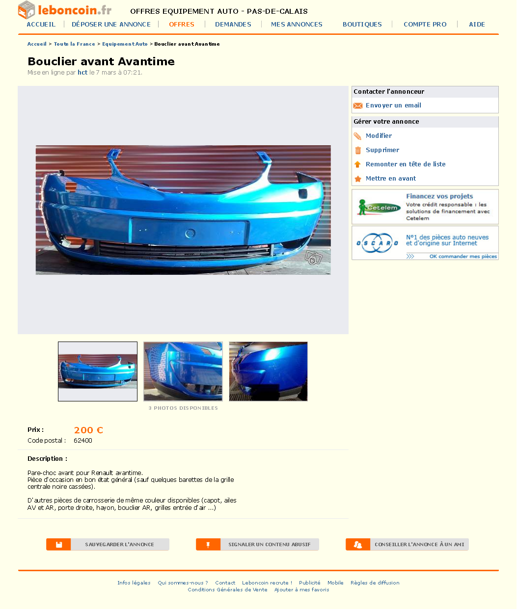 Il y a 1 avant sur le coin-coin pour 200€, aujourd'hui, couleur : bleu