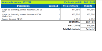 Ça y est, j'ai acheté des amortisseurs Koni, j'ai profité d'une offre spéciale sur Oscaro.es, et j'ai payé les quatre 341€, presque moitié prix... si vous voulez acheter des pièces, il vaut la peine de jeter un coup d’œil sur la page espagnole.