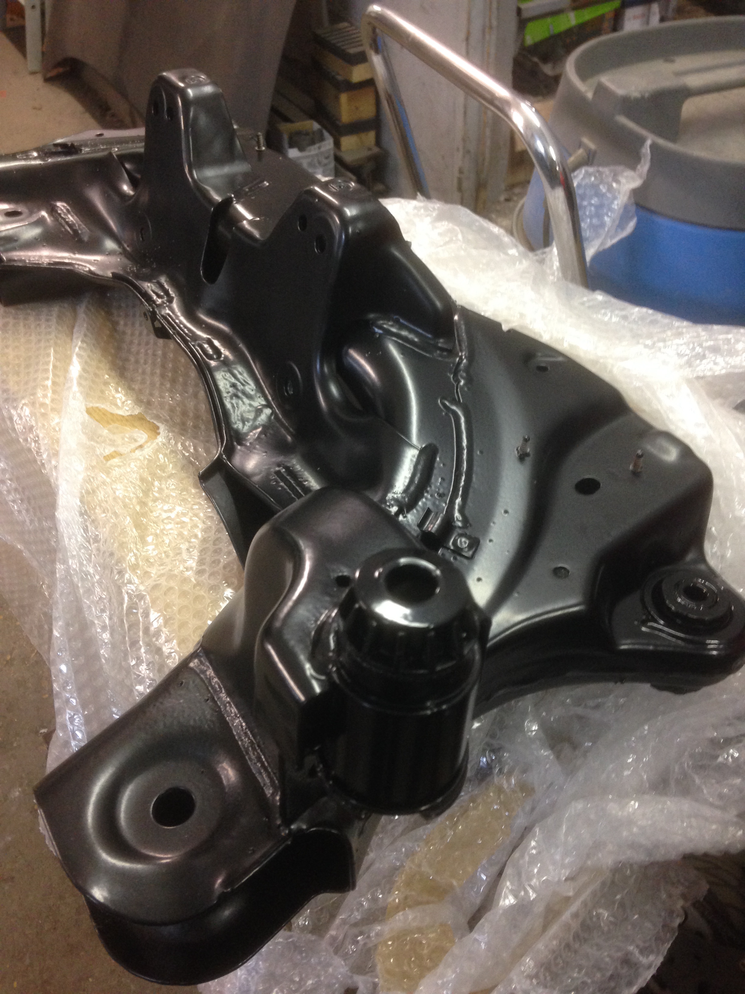 Merci pour les infos sur les triangles.Ci joint photos du berceau récupéré après sablage,impression et peinture époxy au four 200°c.Petit conseil du garagiste; laisser les anciens silent bloc en place pour éviter de devoir poncer et remettre le métal a nu afin de remettre les neufs.Le risque était que le caoutchouc des silent fondent a 200°C lors de la cuisson au four.Un test à été fait avant.Nickel.prix 150€ pour un berceau comme neuf