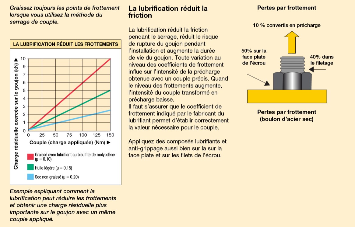) qu'il ne faut pas graisser un filetage, mais le huiler et n'étant pas en accord avec cette information, j'ai enfin trouvé l'info qui confirme que selon: rien, de l'huile ou de la graisse, tout est "bon"... sauf que le couple de serrage pour le même écrou doit être adapté, car le coefficient de frottement est bien différent