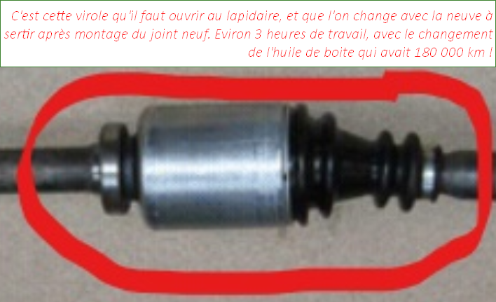 Après moultes réflexions, et n'ayant plus envie de me coucher avec contorsions, sous le carrosse , je suis aller voir un mécanicien de ma connaissance, avec la pièce commandée, il a réalisé l'adaptation du cache poussière (soufflet) en découpant l'ancien puis en remontant le nouveau, il ne restait plus qu'a le sertir à la main et au marteau tout le tour. C'est me connaissant qui a réalisé ce montage, avec ma sympathie, que d'autres peuvent faire aussi pour sauver un cardan devenu introuvable :!: :D La référence de la pièce de rechange :7701470910 que l'on trouve aussi chez oscar et d'autres en GKN22278 ou Quinton Hazell QJB 952...