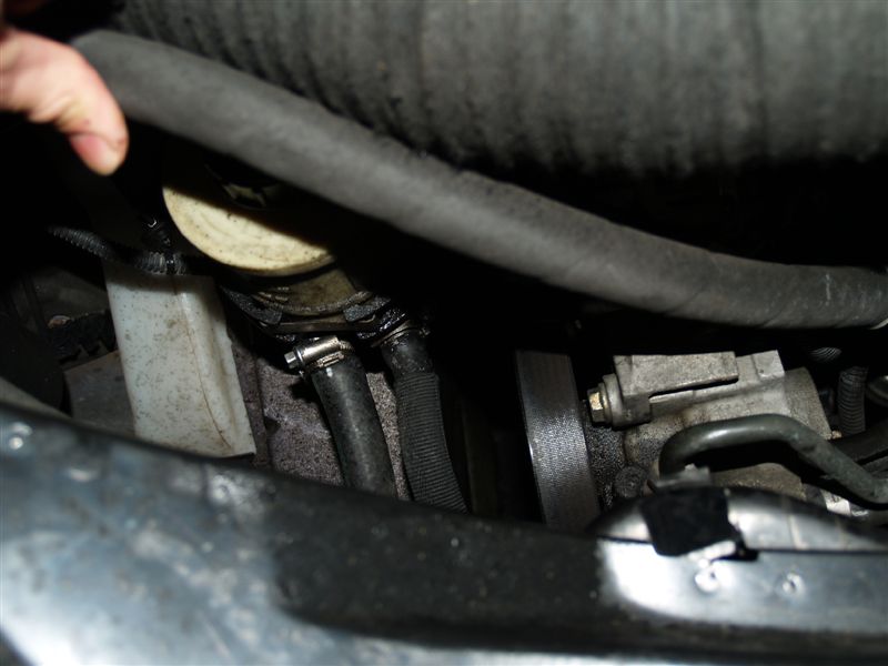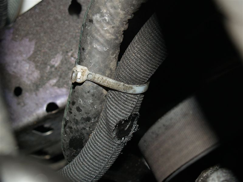 - mais surtout, une fuite de liquide de direction assistée due à une coupure en surface de la durite qui sort de la pompe et passe dans le bouclier ; elle a frotté sur la courroie d'accessoire. Le problème ne semble pas récent, car un rislan avait été mis pour l'écarter... A priori, le garagiste qui m'a fait la courroie de distribution aurait dû le voir, et il ne m'a rien dit ! Le risque est... que la durite lâche, et de perdre la direction assistée... rien que ça ! RdV pris chez mon rono de maisons-laf' pour changer la pièce (environ 54€HT + 1 à 2 heures de main d'oeuvre...)