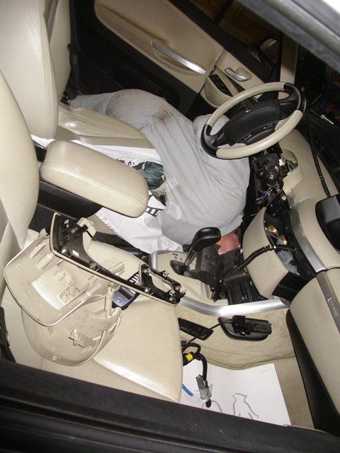 Par contre il faut démonter la décoration autour de la console de boite de vitesse pour pouvoir enlever la moquette verticale à droite des jambes du conducteur.