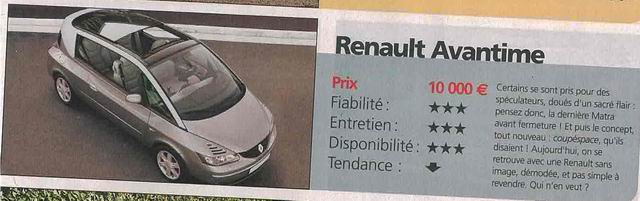 Dans la rubrique "La côte sur mesure - J'aurais pas dû" d'Autoretro n°330 Avril 2009 on parle de l'Avantime (Attention danger - Humour corrosif...)