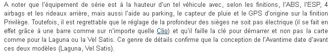 A part quelques défauts exagérés, comme l'espace nécessaires pour ouvrir les portes (j'ai plus de mal a monté dans ma Mégane que dans l'Avantime), la surface de balayage du pare brise insuffisante...mouais, le nombre de places à l'arrière 3 et non 2 .