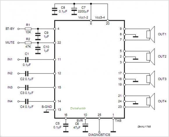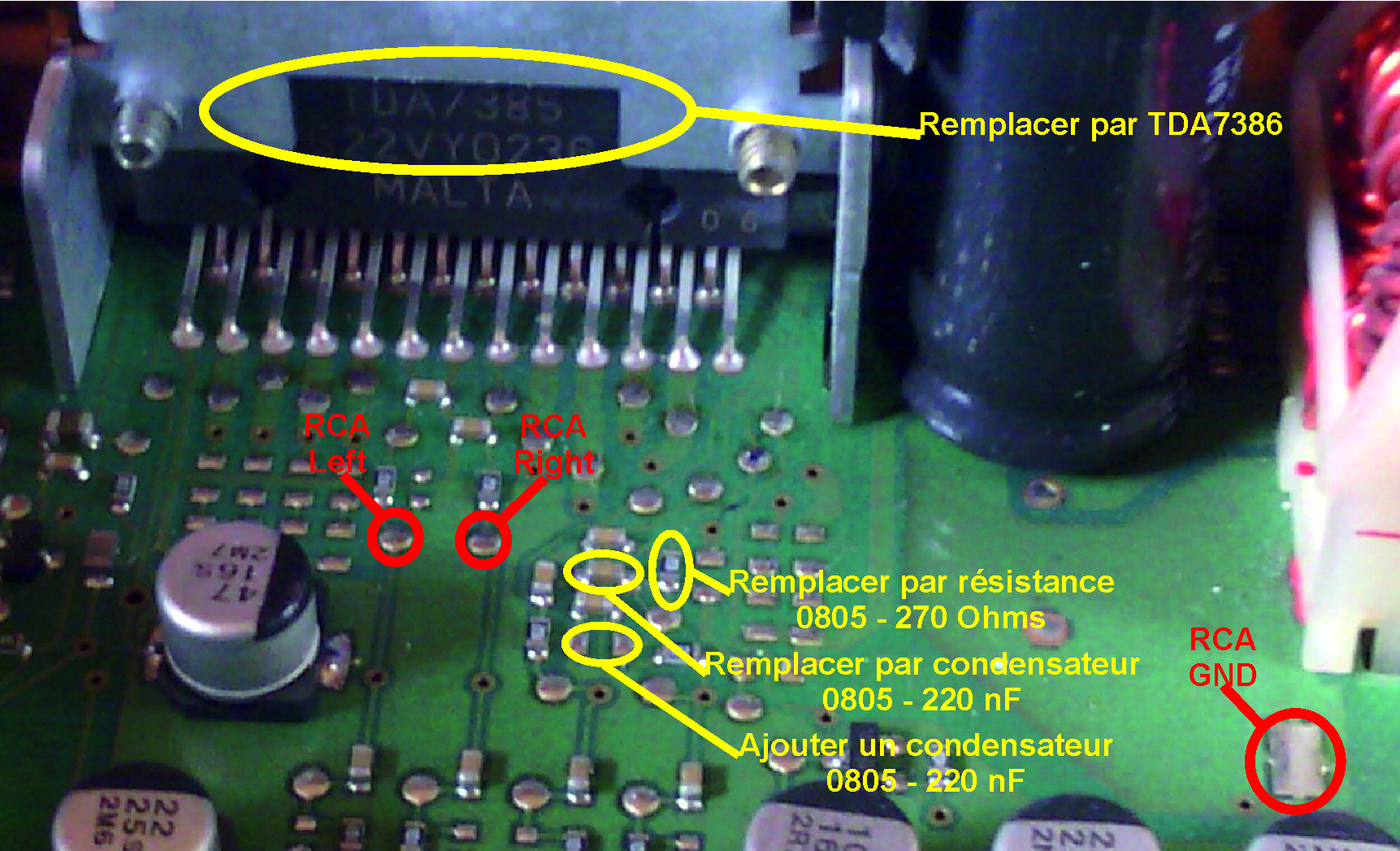 1 / Pour augmenter la puissance de sortie, il est possible de remplacer l'ampli Audio TDA7385 par un TDA7386 en respectant les valeurs fournies dans la documentation du 22DC779/62 mais pour avoir une puissance maximale comme préciser dans la doc du TDA7386 il faut une élévation de tension de son alimentation à 14.4V (petit montage à réaliser et valider).
