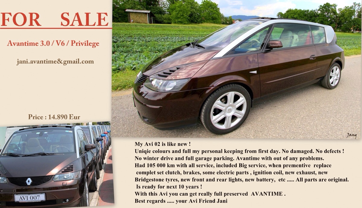 I do not want to sale my Avi. I love it ! My Avi was my road friend who give me up some new dimension. Finally I was meet all of you , my all Avi good and nice peoples from all EU and more. But my Avi is most of the time in garage. I have another 2 cars and no time for him. Yes, I'm a sad, but this is reality. He want new owners, who will keep him like me and who will drive with him with full proud. So, if you want new full keep Avantime for friend........then just please contact me.