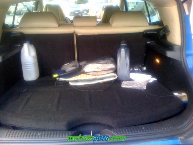 Il bagagliaio dell’auto con l'impianto installato e la cappelliera usata come piano di carico a copertura delle bombole. Il livello del piano in posizione è solo leggermente rialzato rispetto al bordo del portellone.