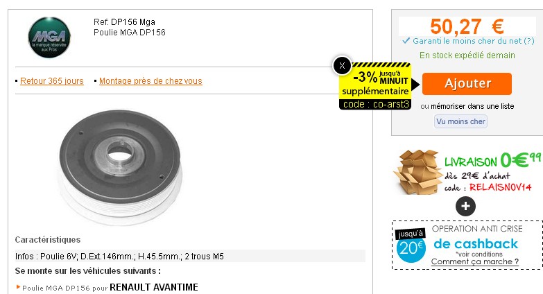 Achat pour 100 Euros sur le net de la poulie et de la courroie qui venait d'être changée avec la distribution... auprès de Yakamachin (qui a trouvé le moyen de m'adresser deux colis identiques le même jour, débité deux fois malgré un seul accord de paiement ?! Bref, aléas du net : la prochaine fois j'irai voir Oscatruc