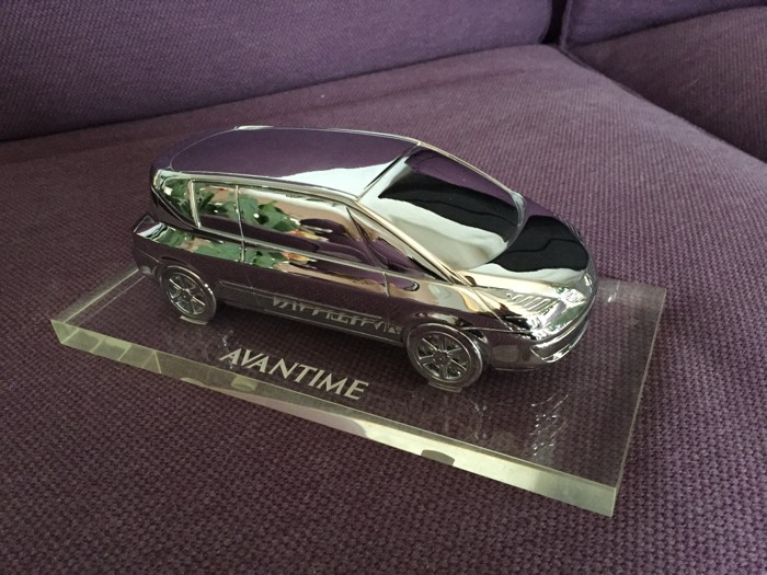Ce modèle réduit est en métal (plus de 2 kg), avec une finition chrome, il est posé sur une plaque en verre comportant l’inscription "Avantime". Le dessous du véhicule est également sculpté.