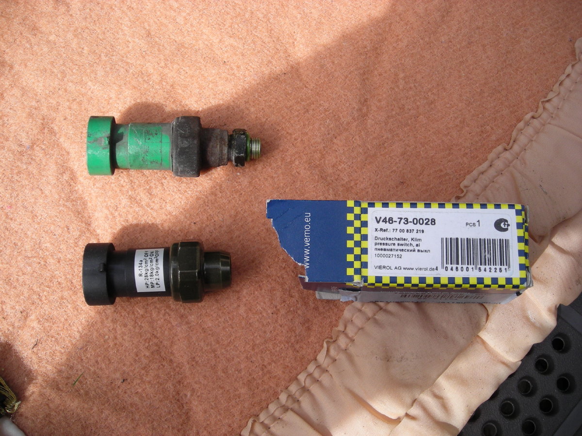 Pour les pièces, j'ai commandé le condenseur NRF 35533, la bouteille déshydratante VEMO V46-06-0002, et le pressostat VEMO V46-73-0028 (référencé Clio/Twingo comme indiqué par Brio), le tout chez Piecesauto24.com. Plus la pochette de joints chez Renault : 77 01 207 465. Tout se monte, sauf que pour remonter le pressostat sur la nouvelle bouteille, il faut récupérer la valve sur l'ancienne. C'est peut-être ce qui explique la différence de prix entre le pressostat Avantime et celui de Clio : celui d'Avantime est peut-être livré avec la valve...