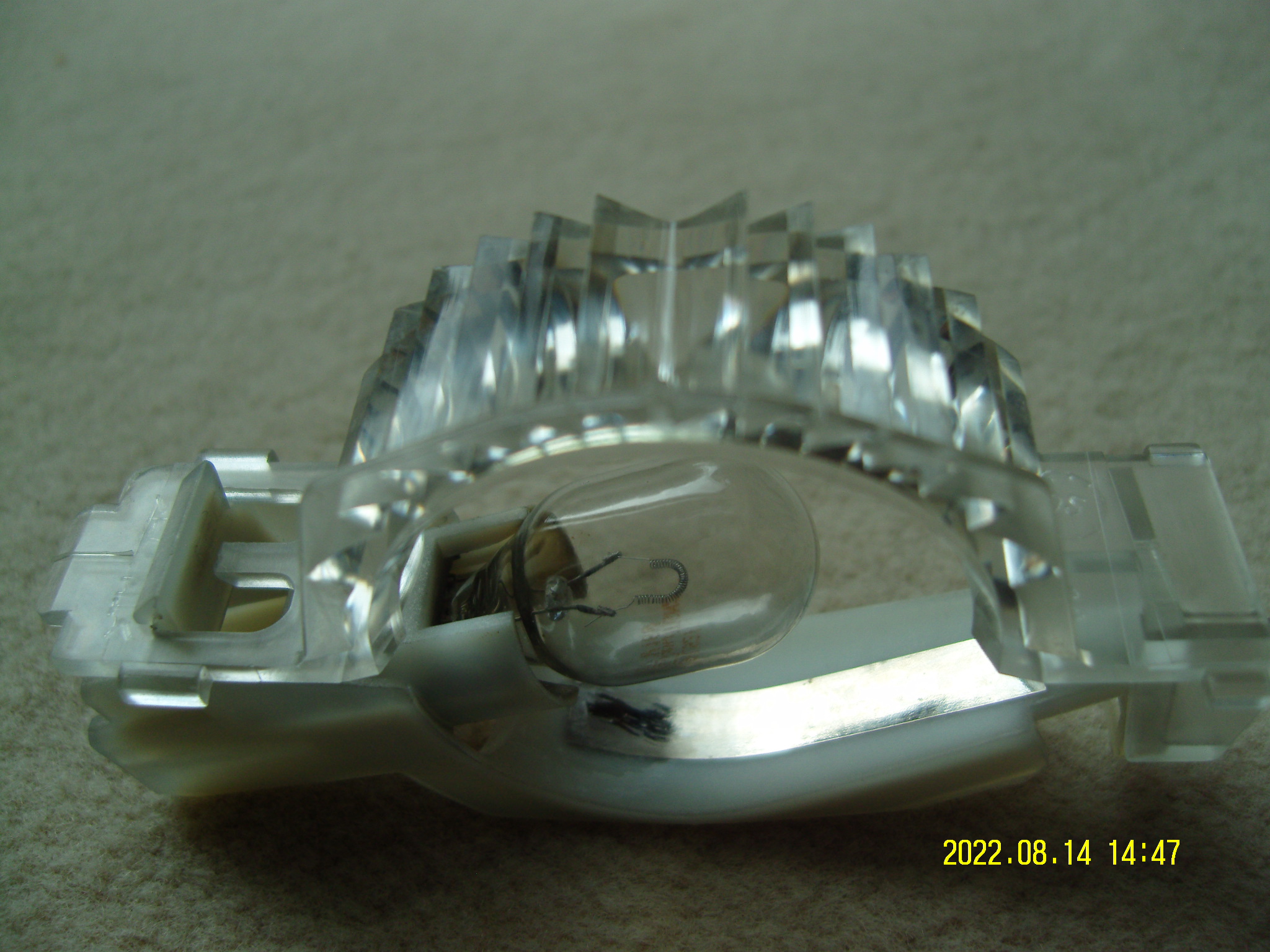 Lors du dernier démontage, j'en ai profité pour améliorer un peu, l'éclairement du plastique rouge. Après démontage du dispositif des lentilles et nettoyage soigneux, j'ai ajouté un petit réflecteur, collé sur la partie concave blanche, derrière l'ampoule et cela est bien moins mal, voir photos: Cette petite lame de Rhodium pure, de 18 µm, d'épaisseur, est collée avec une goutte de gel cyano et aide bien pour l'illumination du plastique rouge